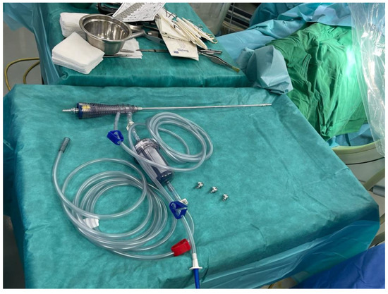The final step of the intervention involved harvesting the autologous bone graft. Cancellous bone has the ability to form new bone even without mechanical stress; however, it may resorb if the recipient site is poorly vascularized. After harvesting the bone from the iliac crest using specialized instrumentation (Figure 9 and Figure 10), the cavity was filled with the graft, and the wound was then closed in layers. The reamer–irrigator–aspirator (ria) 2 system was utilized to harvest bone graft from the contralateral femur and both tibiae, using progressive reamers ranging from 10 mm to 14 mm. The harvested bone volume was adequate to fill the defect after being combined with NovaBone Putty®, a bone substitute manufactured by Novabone, Alachua, FL, USA.
