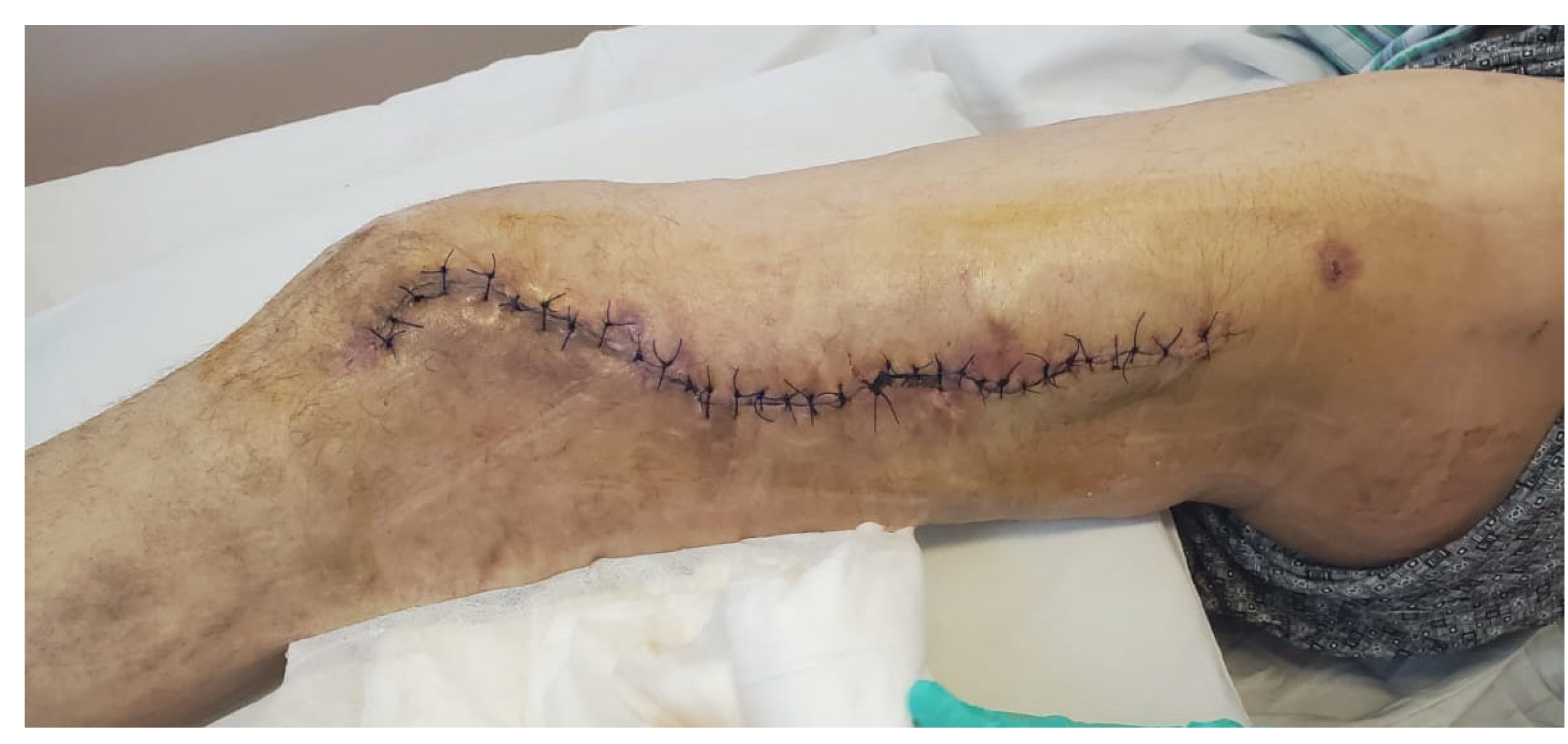 Despite these challenges, a multidisciplinary team was convened, including specialists from anesthesiology, infectious disease, cardiology, and orthopedics, to develop a rigorous and careful strategy. After reaching an agreement, a plan was devised, and the decision was made to proceed with surgery for the patient. The selected approach was to perform the Masquelet technique and attempt to preserve the patient’s limb, given his youth and demanding functional needs.