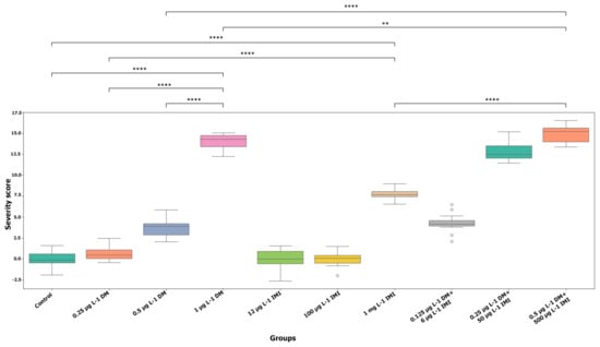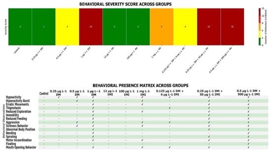 Statistical analysis revealed a significant dose-dependent increase in behavioral severity across experimental groups (p < 0.001, ANOVA, n = 10 per group). Pairwise comparisons showed that the 0.5 µg L−1 DM + 500 µg L−1 IMI group exhibited the highest severity score, significantly exceeding all other groups (p < 0.0001, Tukey post hoc test, n = 10 per group).