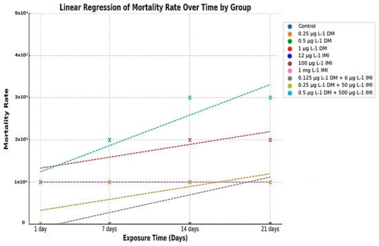 The evaluation of zebrafish mortality following exposure to DM, IMI, and their combinations provided critical insights into the lethal effects of these pesticides. Mortality rates were recorded at four time points (1, 7, 14, and 21 days post-exposure) to assess the progression of lethal effects over time. A linear regression analysis was performed for each exposure group to quantify mortality trends and determine the statistical significance of differences between groups.