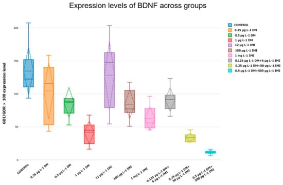 The statistical analysis further confirmed the dose-dependent nature of pesticide-induced behavioral severity. Box plot analysis (Figure 2) revealed significant differences between experimental groups, with behavioral severity scores increasing systematically with pesticide concentration. Pairwise statistical comparisons demonstrated that zebrafish exposed to 1 µg L−1 DM and 1000 µg L−1 IMI exhibited significantly greater behavioral impairments than those exposed to lower concentrations, with p-values below 0.01. The most pronounced differences were observed in the mixed-exposure groups, where behavioral severity was significantly greater than in single-exposure groups. The combination of 0.5 µg L−1 DM and 500 µg L−1 IMI resulted in the most extreme neurotoxic manifestations, showing a statistically significant increase in severity compared to all other groups, with p-values below 0.0001.