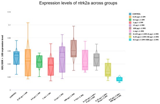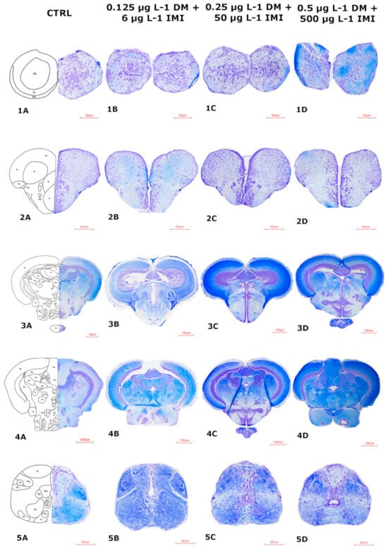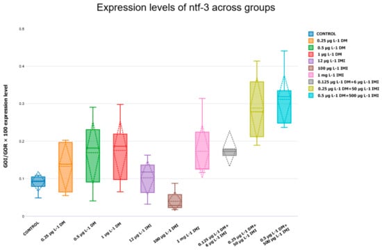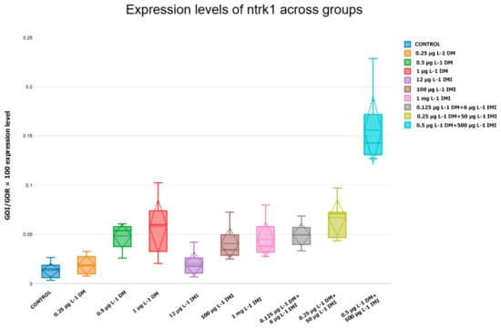 The present study was divided in three parts: first one was dedicated to the single exposure to DM (0.25 µg L−1, 0.5 µg L−1, and 1 µg L−1), the second one to IMI (12 µg L−1, 100 µg L−1, and 1000 µg L−1), and the third one to the combined exposure to DM and IMI (0.125 µg L−1 DM + 6 µg L−1 IMI, 0.25 µg L−1 DM + 50 µg L−1 IMI, and 0.5 µg L−1 DM + 500 µg L−1 IMI). Four tanks were set for each part of the study (three testing tanks and a control group tank). Each tank had a number of 10 animals. A stock solutions of DM (5 µg/mL DM stock solution) and IMI (10 mg/mL IMI stock solution) were prepared by dissolving the product in water. The exposure to each chemical was done by diluting a certain amount from the stock solution into fish’s medium. To maintain the dose of interest, the medium from the testing tanks was changed every 24 h. The study followed a 21 day period, with daily behavioral observations. In addition, the mortality rate was recorded as a consequence of exposure presence. At the end of exposure, fish were euthanized via submersion in ice-cold water for five minutes (until opercular movement ceased) and kept for further investigations (histological and molecular examination). Two additional replicates were included in the studies.