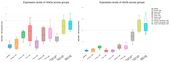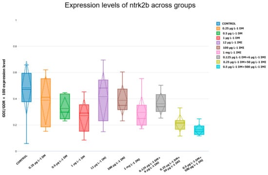 The doses chosen for testing in the study on DM were 0.25 µg L−1, 0.5 µg L−1, and 1 µg L−1 DM (based on previous unpublished data). These were obtained by dissolving a certain amount of the prepared stock solution in the zebrafish medium.