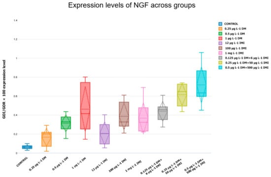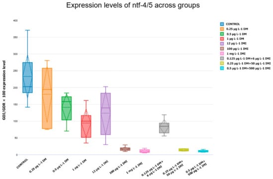 In the mixed study, we combined DM with IMI in the following concentrations: 0.125 µg L−1 DM + 6 µg L−1 IMI; 0.25 µg L−1 DM + 50 µg L−1 IMI; and 0.5 µg L−1 DM + 500 µg L−1 IMI. For every study, we had a control group that did not receive any pesticide concentrations.