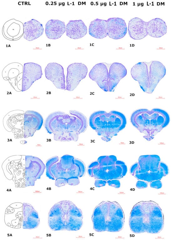 To assess structural integrity and detect potential neuronal damage, Luxol Fast Blue–Cresyl Violet (LFB-Cr. V) staining was performed. This enables the differentiation of gray and white matter regions and the visualization of neuronal and glial cell populations. Following staining, the sections were dehydrated, cleared, and coverslipped with DPX mounting medium for long-term preservation.