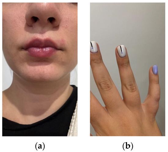 The erythema around the mouth (a) and on the finger (b). The pictures were taken by the patient at the time of the second exposure.