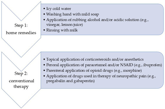 Final considerations, taking into account the presented case reports, suggest no uniform treatment approach for “chili burns”, but only the existence of a two-step gradual therapy consisting of household items, and in the case of lack of efficacy, further proceeding to conventional drugs. Therefore, the suggested management of “chili burns” is given in Figure 3.