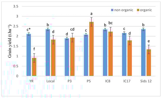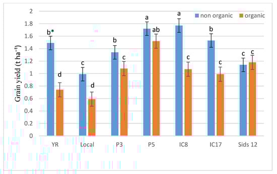 Grain yield (t ha−1) of the seven wheat genotypes under conventional and organic fertilization treatments in the 2020 season. * Means separated by same lowercase letters (a, b, c, and d) in the figure were not significant at p = 0.05.