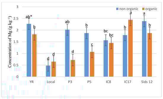 Concentrations of Mg (g kg−1) in the grains of the seven wheat genotypes under conventional and organic fertilization treatments in Saudi Arabia. * Means separated by same lowercase letters (a, b, c, and d) in the figure were not significant at p = 0.05.