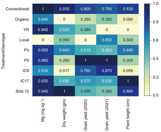 A factorial experiment within a randomized complete block design (RCBD) was used to assess the effects of fertilization treatments (conventional and organic) and wheat genotypes on various measured parameters. Statistical analyses were performed using JMP Ver. 11 [30]. An analysis of variance (ANOVA) was performed to assess the differences in Mg content in grains, plant dry weight, grain yield, and plant height between organic and conventional fertilizer application across the seven genotypes for both 2020 and 2021 seasons. Duncan’s multiple range tests were used to determine significant differences between treatment means. A linear mixed model was used in which wheat genotypes and fertilization methods factors were regarded as fixed factors. Statistical significance was set at p < 0.05. Heatmaps were plotted and analyzed using XLSTAT software version 2019.