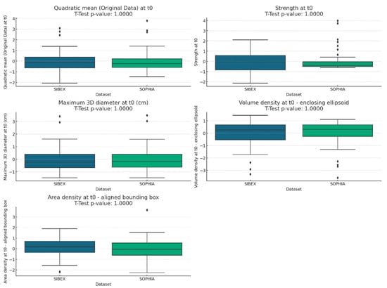 The boxplots for each feature showed similar distributions between the SOPHIA and SIBEX datasets. The inclusion of t-test p-values in the titles confirmed the lack of statistically significant differences. This visual analysis supports the conclusion that the features extracted by both software packages are comparable, as shown in Figure 1.