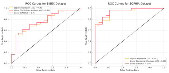 ROC curves for classification models trained on SOPHIA and SIBEX datasets. ROC (Receiver Operating Characteristic) curves depicting the performance of Logistic Regression, LDA, and Linear SVM models on SOPHIA and SIBEX datasets. The area under the curve (AUC) highlights superior predictive accuracy for models based on SOPHIA-extracted features, particularly for Logistic Regression and Linear SVM. Differences in AUC values further underscore the impact of feature extraction variability on model performance, highlighting the impact of software choice in radiomics workflows.