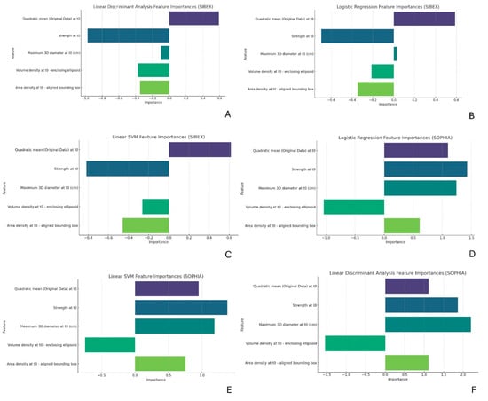 (A–F): Feature importance analysis for predictive models. Bar charts representing the importance of radiomic features in Logistic Regression, LDA, and Linear SVM models. “Quadratic mean” and “Strength” consistently emerge as key predictive features, despite minor variations in their ranked importance across datasets. Differences in “Volume density” and “Area density” values between SOPHIA and SIBEX datasets are evident, aligning with observed discrepancies in Spearman correlations and suggesting a need for fine-tuning before these features can be used reliably across different software and institutions.