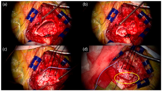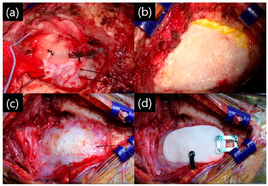 Depending on the size of the suture site, one or more sutures may have been performed. Sutures were performed from the caudal side to the cranial side in turn, especially before the last suture, to ensure sufficient filling of the saline inside the dura. This was carried out to prevent complications, such as subdural hemorrhage caused by a bridging vein injury and the consequently large outflow of CSF during surgery. After completing the dural suturing, the surgeon checked whether there was any leakage of CSF and placed the fibrin sealant, TachoSil®, on top of the layer. The TachoSil® sealants were large enough to cover the entire craniotomy site (Figure 3b). TachoSil® is spongy collagen, which is coated with the human clotting factors thrombin and fibrinogen. It can be easily applied to the desired surgical site, and when in contact with blood or other body fluids or saline, it adheres firmly to the applied surface [18]. This is absorbed by the body within a few weeks. Next, Tisseel fibrin glue (Biotek Pharma, Baxter Healthcare Ltd., Thetford, Norfolk, UK) was applied over that layer (Figure 3c). Finally, polymethylmethacrylate (PMMA) bone cement was made to fit the size of the bone flap and fixed with a titanium screw and plate (Figure 3d).