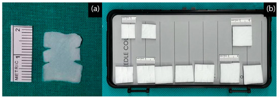 This suture was later fixed to the bone flap. After tagging the sutures, dural suturing was performed on the remaining unsutured site, usually starting from the caudal side. Prior to insertion, Duragen® was trimmed to the appropriate size. To facilitate tying, slits were made on either side of the graft rather than using a rectangular piece. Typically, two slits were made, but depending on the size of the suture site, one or three slits could be used (Figure 2a,b). After preparation, Duragen® was inserted between two sutures placed at each site before tying (Figure 3a).