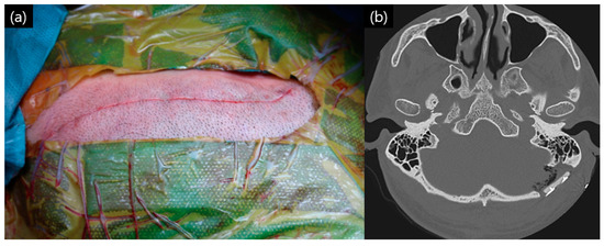 Completed closure: (a) operation site after subcutaneous layer suture; (b) immediate postoperative temporal bone computed tomography (CT) of the patient.