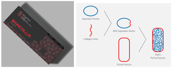 Human recombinant collagen is used as a skin booster and is injected intradermally to enhance skin quality. The product shown is SkinColla (Maypharm Inc., Seoul, Republic of Korea). It is 100% identical to human collagen, with its gene sequence matching the authenticated human collagen sequence in the GenBank database. The process includes gene design, gene cloning into a vector, production, analysis, and the extraction of human recombinant collagen [20].
