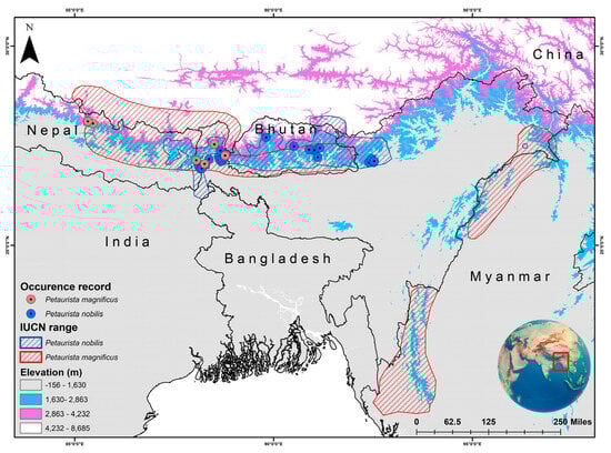 The two Petaurista species are found in two major biodiversity hotspots, the Eastern Himalayas and Indo-Burma, each with diverse ecosystems and climates [55]. The Eastern Himalayas, spanning parts of India, Bhutan, Nepal, and Myanmar, include forests ranging from tropical lowlands to alpine meadows, with temperatures from −30 °C to 35 °C and rainfall up to 5000 mm. Indo-Burma, covering northeastern India, Myanmar, and Southeast Asia, features tropical rainforests, wetlands, and montane forests, with temperatures from 5 °C to 40 °C and rainfall reaching 4000 mm. Specifically, P. magnificus is found in patches of evergreen forests, occurring at elevations ranging from 400 m above sea level (a.s.l.) in Arunachal Pradesh, India, to 3700 m a.s.l. in Nepal [30]. In contrast, P. nobilis primarily inhabits montane forests, with a distribution spanning an elevation gradient of 1500 to 3000 m a.s.l. [32].