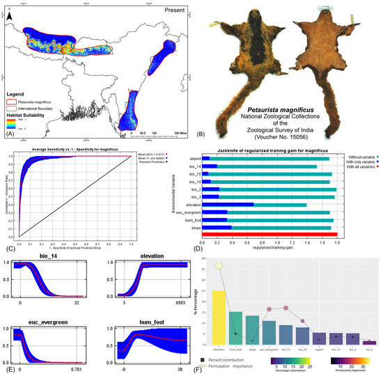 (A) Suitable area with IUCN extent delineated by the HCM approach for Petaurista magnificus in the present scenario. (B) Photo of the preserved stuffed skin of P. magnificus archived at the National Zoological Collections of the Zoological Survey of India. (C) Average training ROC (receiver operating characteristic) for the model. (D) Jackknife test for all the selected variables, where the blue bar shows the importance of each variable in explaining the data variation when used separately. The green bar shows the loss in overall gain after the particular variable was dropped. Red bar = total model gain. (E) Response curves of the major contributing predictors governing the habitat suitability of P. magnificus. (F) Percentage contribution and permutation importance of covariates.