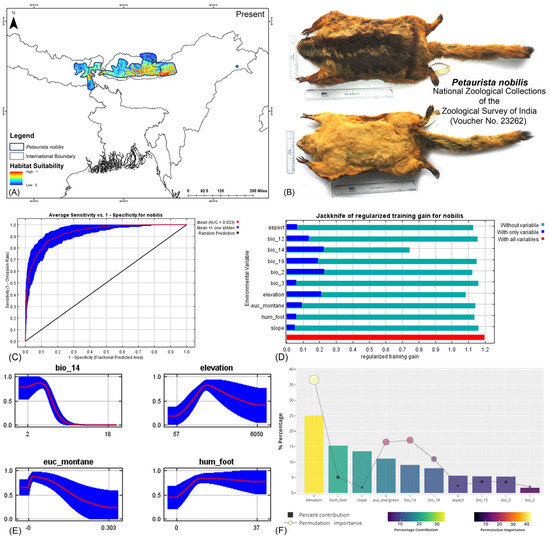 (A) Suitable area with IUCN extent delineated by the HCM approach for Petaurista nobilis in the present scenario. (B) Photo of the preserved stuffed skin of P. nobilis archived at the National Zoological Collections of the Zoological Survey of India. (C) Average training ROC (receiver operating characteristic) for the model. (D) Jackknife test for all the selected variables, where the blue bar shows the importance of each variable in explaining the data variation when used separately. The green bar shows the loss in overall gain after the particular variable was dropped. Red bar = total model gain. (E) Response curves of the major contributing predictors governing the habitat suitability of P. nobilis. (F) Percentage contribution and permutation importance of covariates.