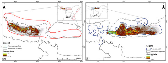 In the current scenario, habitat connectivity for P. magnificus is primarily restricted to eastern Nepal and the Nepal–India border region, with a mean connectivity value of 0.1118 (Figure 4). In contrast, for P. nobilis, corridor connectivity was identified within Bhutan and across transboundary regions, specifically between Bhutan and Arunachal Pradesh (India) as well as Bhutan and Sikkim (India), with a mean connectivity value of 0.6368 (Figure 4).