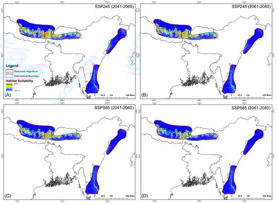 Suitable habitats for Petaurista magnificus within the IUCN extent under different future climatic scenarios with HCM approach. (A,B) represent SSP245, and (C,D) represent SSP585 for 2041–2060 and 2061–2080, respectively.