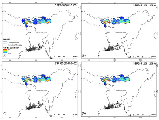Suitable habitats for Petaurista nobilis within the IUCN extent under different future climatic scenarios with HCM approach. (A,B) represent SSP245, and (C,D) represent SSP585 for 2041–2060 and 2061–2080, respectively.