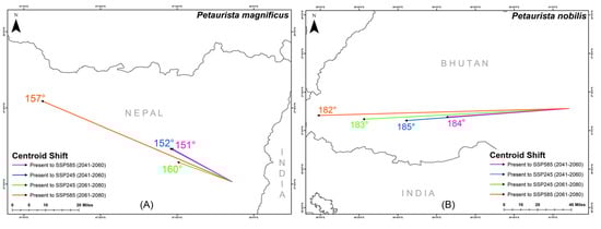 Centroid shift for two flying squirrel species from present to different future climatic scenarios within their IUCN extent with HCM approach. (A) Petaurista magnificus, (B) Petaurista nobilis.