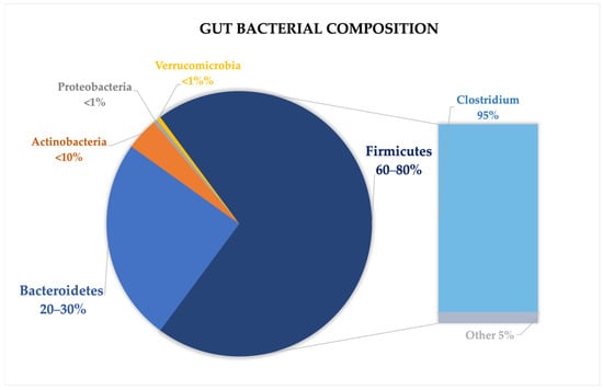 The gut microbiome is composed of over 1500 species, with Firmicutes and Bacteroidetes accounting for over 90% of the total microbial population. Other less abundant phyla include Proteobacteria, Actinobacteria, Verrucomicrobia, and Fusobacteria [18,20]. The Firmicutes phylum encompasses over 200 genera, including well-known ones like Lactobacillus, Bacillus, Clostridium, Enterococcus, and Ruminococcus. Within this group, the Clostridium genus constitutes the vast majority, accounting for approximately 95% of the phylum. Meanwhile, the Bacteroidetes phylum is primarily made up of dominant genera such as Bacteroides and Prevotella [20,21,22] (Figure 1).