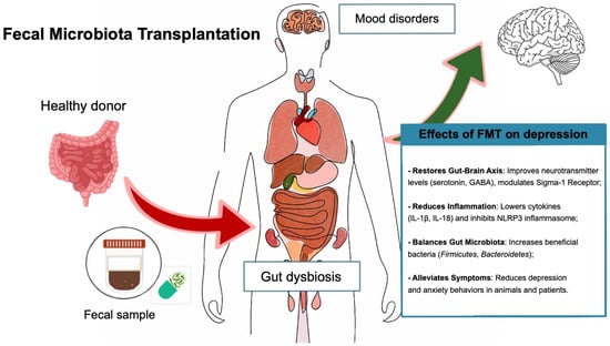 - Zhang, Q.; Bi, Y.; Zhang, B.; Jiang, Q.; Mou, C.K.; Lei, L.; Deng, Y.; Li, Y.; Yu, J.; Liu, W.; et al. Current landscape of fecal microbiota transplantation in treating depression. Front. Immunol. 2024, 15, 1416961. [Google Scholar] [CrossRef]