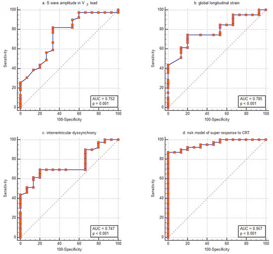Receiver operating characteristic (ROC) curve for assessing the ability of (a) S wave amplitude in the V2 lead, (b) global longitudinal strain, (c) interventricular dyssynchrony and (d) the entire risk model to distinguish between patients with a super-response to CRT and those without.