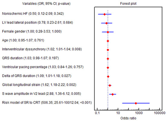 The GLS (OR = 1.62; 95% CI 1.18–2.22; p = 0.002), ∆QRS (OR = 1.09; 95% CI 1.01–1.18; p = 0.027), amplitude of the S wave in the V2 lead (OR = 2.88; 95% CI 1.35–6.12; p = 0.005), IVD (OR = 1.02; 95% CI 1.00–1.03; p = 0.008), baseline LVEF (OR = 0.81; 95% CI 0.69–0.96; p = 0.015), SV (OR = 0.95; 95% CI 0.92–0.99; p = 0.018), E/e′ (OR = 0.90; 95% CI 0.81–0.99; p = 0.045) and HBW LV (OR = 0.99; 95% CI 0.98–0.99; p = 0.037) were independently associated with the CRT super-response in univariable logistic regression (Figure 3).