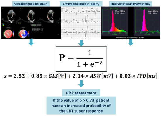 The values of GLS (in %), amplitude of the S wave in the V2 lead (in mV), and IVD (in ms) should be entered into the assessment equation. The outcome of the logistic equation presented below is the probability (p) of a super-response to CRT. When the value of p exceeds 0.73, this risk assessment enables the identification of HF patients who have a higher likelihood of achieving a super-response to CRT (Figure 4).