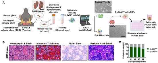 Nguyen LTP, Kim JH, Son J, Hur SS, Lee M, Byeon HK, Kim J-Y, Ban MJ, Kim JH, Lee MR, et al. 3D Spheroid Cultures for Salivary Gland Tissue Engineering: Effects of Fibroblast on Epithelial Cell Function. Life. 2025; 15(4):607. https://doi.org/10.3390/life15040607