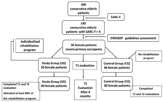 Final Sample: Following the initial screening and comprehensive evaluation, a total of 96 patients met the diagnostic criteria for severe primary sarcopenia, as defined by the EWGSOP2 [24]. All eligible individuals during the recruitment period were women. The final sample was established based on strict inclusion and exclusion criteria, full compliance with the screening protocol (including SARC-F, SPPB, and SarQoL assessments), and voluntary consent to participate in the study. Patients were evaluated at baseline (T1) by a multidisciplinary team comprising physical medicine specialists and physiotherapists.