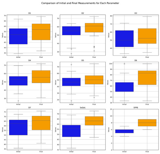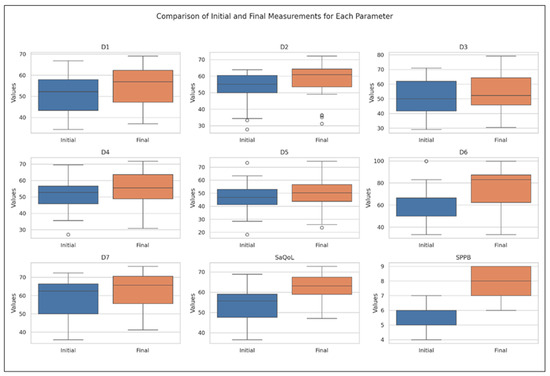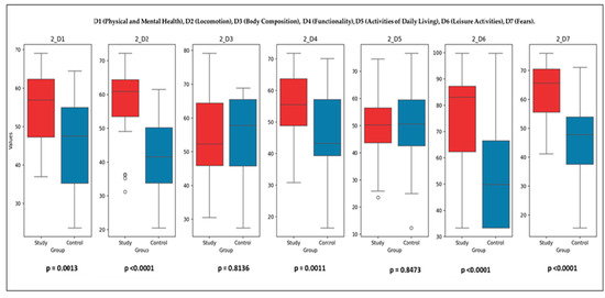 - Parameters with No Significant Differences (p ≥ 0.05): D3 (body composition) (p > 0.05) and D5 (activities of daily living) (p > 0.05) did not show significant changes, suggesting that these parameters were less influenced by the intervention.