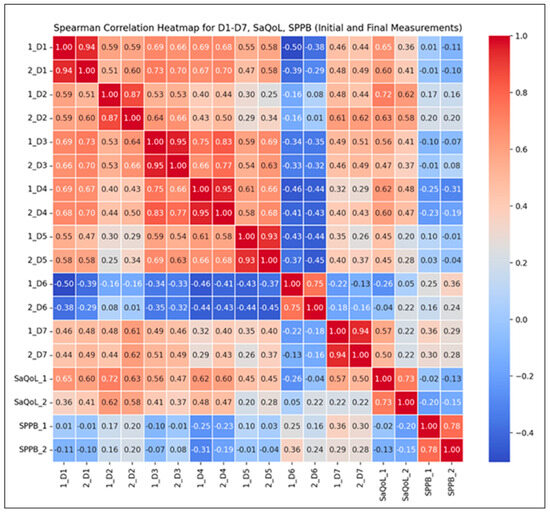 - Parameters with Significant Differences (p < 0.05): D1 (physical and mental health), D2 (locomotion), D4 (functionality), D6 (leisure activities), D7 (fears), and SaQoL total score (p = 9.78 × 10−6) showed highly significant improvements in the SG compared to the CG. SPPB (short physical performance battery) demonstrated an extremely significant difference (p = 2.01 × 10−11), highlighting the profound effect of the rehabilitation program on physical performance;
