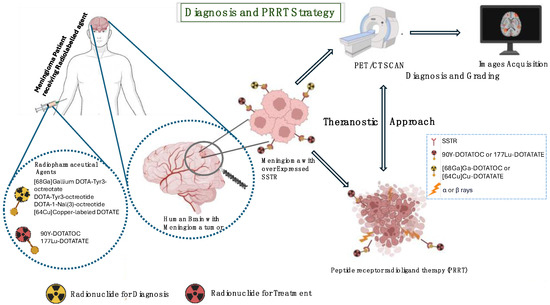 - Albert, N.L.; Preusser, M.; Traub-Weidinger, T.; Tolboom, N.; Law, I.; Palmer, J.D.; Guedj, E.; Furtner, J.; Fraioli, F.; Huang, R.Y.; et al. Joint EANM/EANO/RANO/SNMMI practice guideline/procedure standards for diagnostics and therapy (theranostics) of meningiomas using radiolabeled somatostatin receptor ligands: Version 1.0. Eur. J. Nucl. Med. Mol. Imaging 2024, 51, 3662–3679. [Google Scholar] [CrossRef] [PubMed]