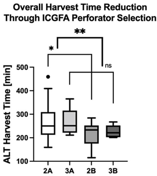3.4. Comparison of Flap Harvest Times Between ICGFA-Assisted Perforator Selection Versus Conventionally Raised ALT Flaps