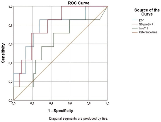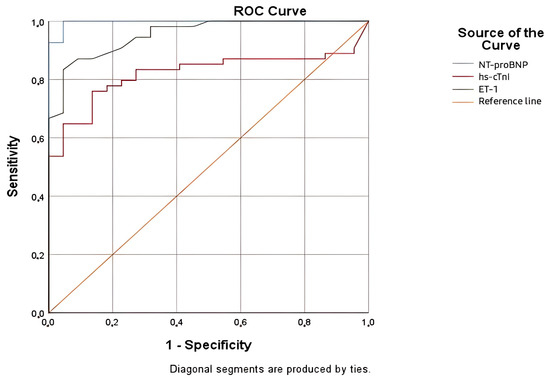 NT-proBNP remained the most accurate marker, with an almost perfect AUC of 0.997. However, ET-1 can offer a complementary role, broadening the diagnostic approach and adding robustness to clinical evaluations. In contrast, hs-cTnI, with an AUC of 0.820, showed moderate accuracy and was less reliable as a standalone marker (Table 9).