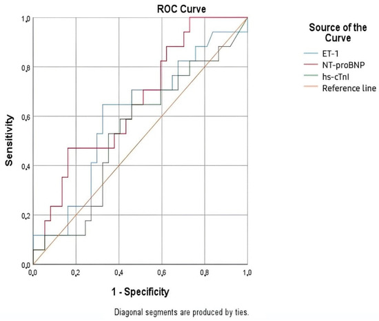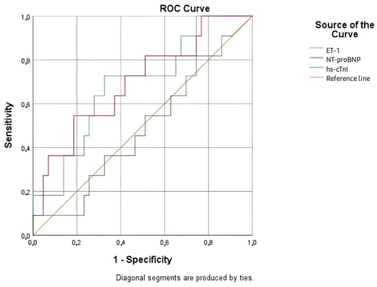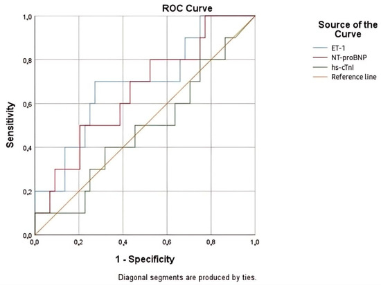 The analyzed biomarkers had limited capacity to predict 1-year mortality, as depicted in Figure 9. NT-proBNP remained the best-performing biomarker, although its statistical significance was marginal (AUC = 0.658; p = 0.064). ET -1 and hs-cTnI were not useful in this context for predicting long-term mortality (Table 14).