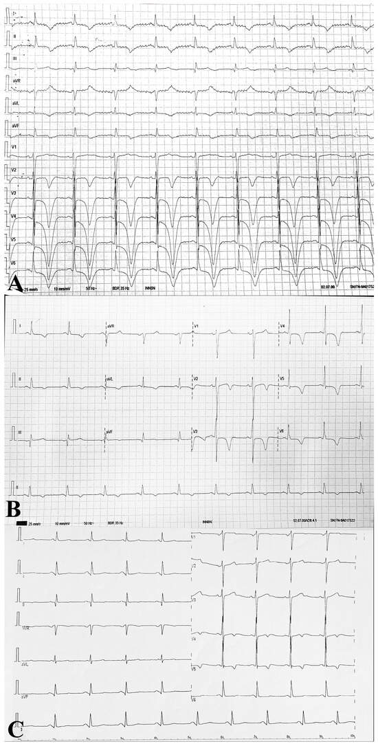 (A) Admission ECG shows sinus rhythm (HR 58 bpm), ST depression and deep negative T waves in V2–V6, generalized T wave inversion, q waves in the inferior leads, narrow QRS, no conduction disorders, left ventricular hypertrophy (Sokolow–Lyon index > 35 mm), and prolonged QTc (616 ms). (B) Day 7 ECG: sinus rhythm (HR 58 bpm), mild ST elevation (<0.5 mm) in V2, persistent but less pronounced negative T waves in V2–V6 and lateral leads, q waves in inferior leads, Sokolow–Lyon index of 37 mm, and QTc 500 ms. (C) Six-month follow-up ECG: sinus rhythm (HR 60 bpm), persistent q waves in inferior leads, and negative T waves in V4–V6.
