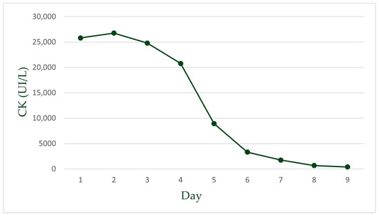 CK levels from day 1 to day 9 of admission. A progressive and substantial decline in CK levels was observed following the discontinuation of atorvastatin, consistent with recovery from muscle injury.