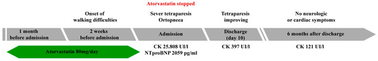 Timeline of symptom onset, atorvastatin treatment, clinical course, and biochemical markers. Atorvastatin at 80 mg/day was initiated one month prior to admission. The patient developed walking difficulties two weeks before admission, progressing to severe tetraparesis and orthopnea at presentation. Atorvastatin was discontinued upon admission. CK levels decreased from 25,808 U/L at admission to 397 U/L at discharge and had normalized by 6-month follow-up (121 U/L). NT-proBNP was elevated at admission (2059 pg/mL). Full neurologic and cardiac recovery was achieved in 6 months.