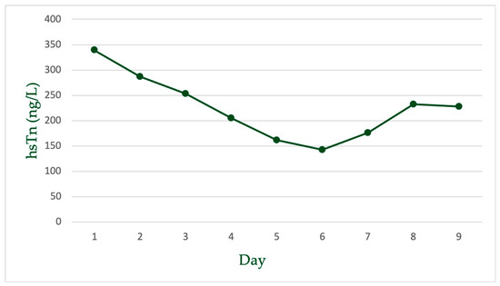 High-sensitivity troponin T (hsTn) was elevated, but there was no rise-and-fall pattern, and the levels were less pronounced than what would be expected in a myocardial infarction (Figure 4) [39].