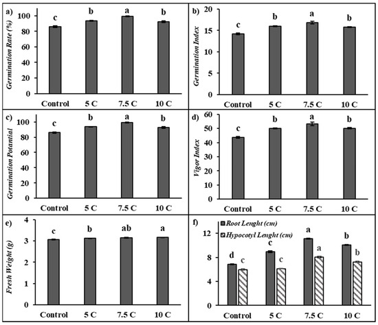 The contents of total soluble protein and carbohydrates were evaluated in seed tissues compared to the control. As seen in Table 3, the contents of total soluble protein were remarkably increased by 13.58%, 23.82%, and 11.52% under the 5, 7.5, and 10 C applications, respectively. The values of the total soluble protein contents were recorded as 12.79, 14.53, 15.84, and 14.26 mg g−1 FW in the control, 5, 7.5, and 10 C applications, respectively. In seed tissues, 5, 7.5, and 10 C applications decreased by 15.09%, 25.67%, and 20.29% in the contents of total carbohydrates, respectively (Table 3). The values of the total carbohydrate contents were determined to be 137.62, 116.85, 102.30, and 109.70 mg g−1 FW in the control, 5, 7.5, and 10 C applications, respectively.