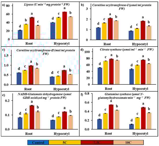 Effects of exogenous carnitine applications on activities of lipase (a), carnitine acyltransferase I (CATI) (b), carnitine acyltransferase II (CATII) (c), citrate synthase (CS) (d), glutamate dehydrogenase (NADH-GDH) (e), and glutamine synthase (GS) (f) in the roots and hypocotyls of 5-day-old maize seedlings (5 C: 5 µM carnitine; 7.5 C: 7.5 µM carnitine; 10 C: 10 µM carnitine). Different letters in the figure indicate significant differences within values by Duncan′s test at p < 0.05.