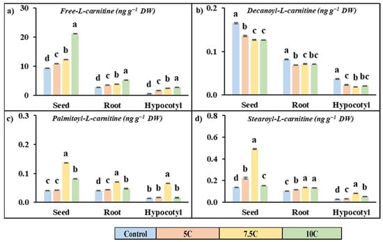Carnitine treatment generally increased the content of long-chain acylcarnitine (palmitoyl-L-carnitine and stearoyl-L-carnitine) but decreased the medium-chain acylcarnitine content (decanoyl-L-carnitine) compared to the control in all parts of the plant (Figure 3b–d). The high values were recorded for the 7.5 C treatment. For the 7.5 C application, the increased rates of palmitoyl-L-carnitine were 2.65%, 230.08%, and 96.06% for seeds, 9.11%, 73.17%, and 17.71% for roots, and 18.54%, 367.67%, and 16.30% for hypocotyls, respectively. The increased rates of stearoyl-L-carnitine were 61.11%, 256.27%, and 12.80% for seeds, 12.98%, 32.50%, and 28.48% for roots, and 19.30%, 194.08%, and 91.65% for hypocotyls, respectively. Carnitine treatment did not exhibit a stimulating effect on decanoyl-l-carnitine content. For the 7.5 C treatment, the declining rates of decanoyl-L-carnitine contents were 17.77%, 23.32%, and 23.50% for seeds, 26.24%, 12.58%, and 13.75% for roots, and 37.39%, 50.57%, and 43.72% for hypocotyls, respectively.