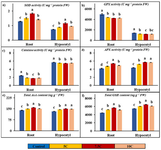 Effects of exogenous carnitine applications on activities of superoxide dismutase (SOD) (a), guaiacol peroxidase (GPX) (b), catalase (c), ascorbate peroxidase (APX) (d), total ascorbate (AsA) (e), and total glutathione (GSH) (f) in the roots and hypocotyls of 5-day-old maize seedlings (5 C: 5 µM carnitine; 7.5 C: 7.5 µM carnitine; 10 C: 10 µM carnitine). Different letters in the figure indicate significant differences within values by Duncan′s test at p < 0.05.