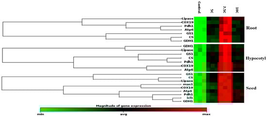 Effects of exogenous carnitine on the gene expression of lipase, citrate synthase, cytochrome oxidase, pyruvate dehydrogenase, ATP synthase, glutamate dehydrogenase, and glutamine synthase in the seeds, roots, and hypocotyls of 5-day-old maize seedlings. Additionally, exogenous carnitine’s effect on the gene expression levels of isocitrate lyase and malate synthase gene expression levels in seeds is shown. The clustergram performs non-supervised hierarchical clustering of the entire dataset to display a heat map with dendrograms indicating co-regulated genes across groups.